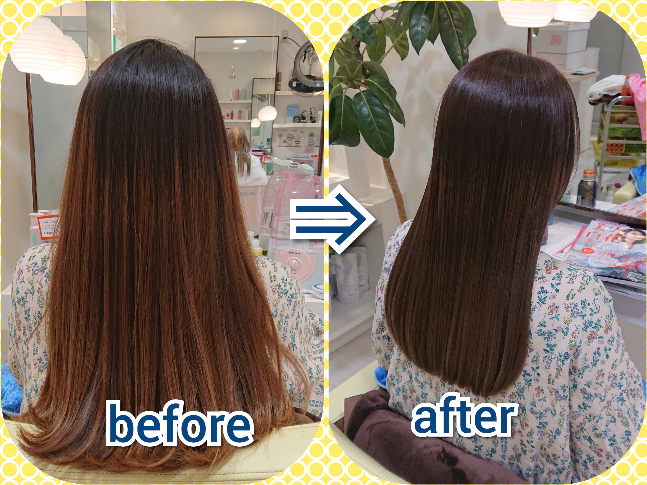 今日、半年振りにご来店されたK様。冬の間はこもっていて伸ばしっぱなしになっていたようですが…久しぶりにご来店して頂きモチベーションが上がったぁ~⤴️⤴️また頑張れる!!とおっしゃって頂きました(^-^)/手触りもツヤも色も落ち着いてキレイになりましたね✨次は早めにお待ちしております(*^ー^)ノ♪